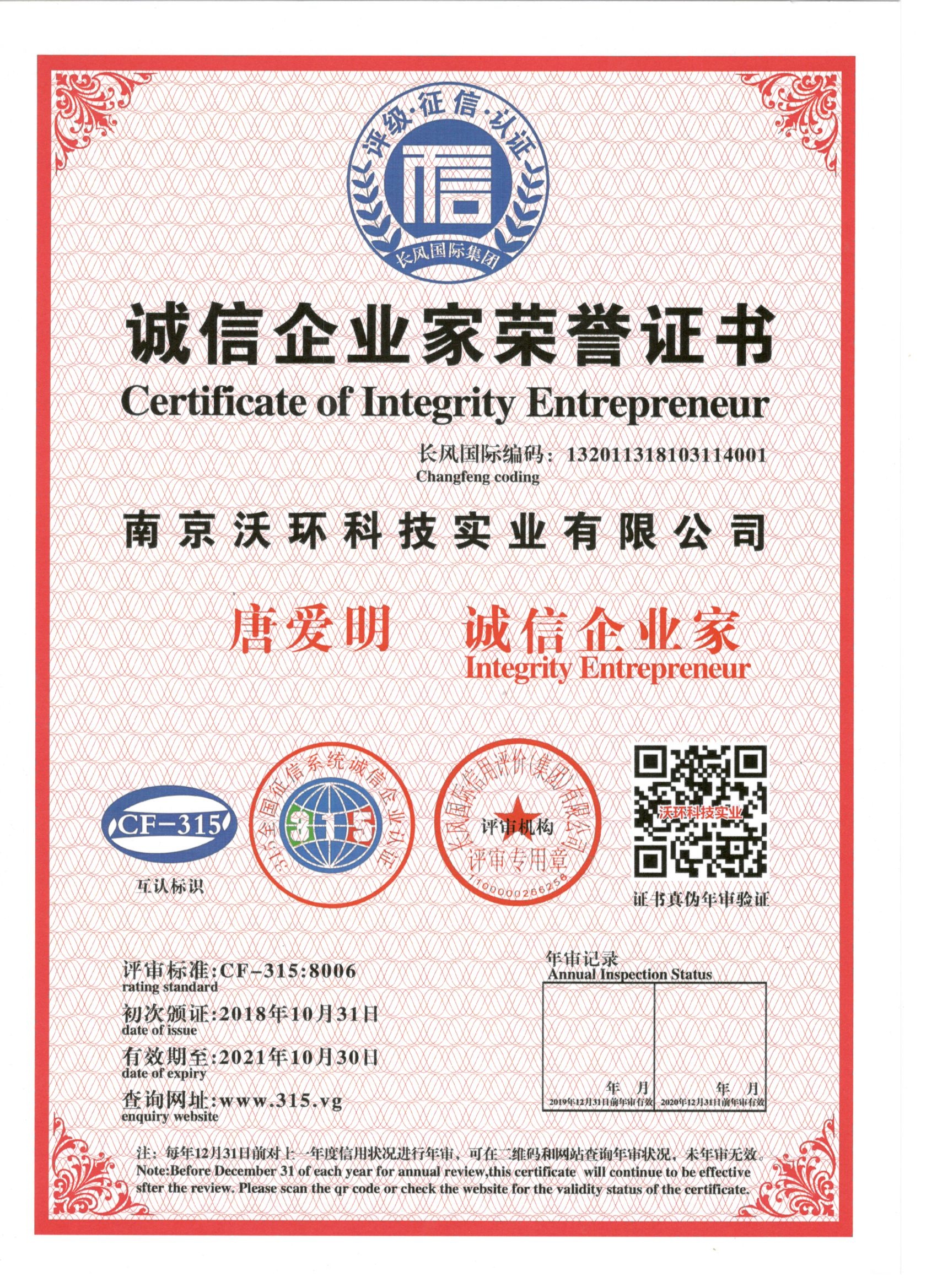 熱烈祝賀南京沃環(huán)公司唐愛(ài)明先生被專業(yè)評(píng)審機(jī)構(gòu)-長(zhǎng)風(fēng)國(guó)際集團(tuán)評(píng)為誠(chéng)信企業(yè)家,特發(fā)此證書
